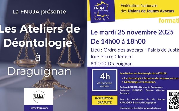 L'UJA de Draguignan reçoit « Les Ateliers de Déontologie » de la FNUJA, formation qui se tiendra le mardi 25 novembre 2025 de 14h à 18h à l'Ordre des avocats - Palais de Justice, Rue Pierre Clément, 83000 DRAGUIGNAN. La formation « Les Ateliers de Déontologie » sera dispensée en présentiel par : Me...