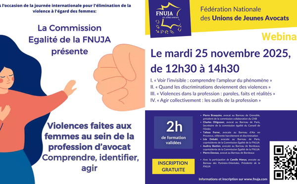 À l’occasion de la journée internationale pour l'élimination de la violence à l'égard des femmes, la FNUJA propose une formation sur les "violences faites aux femmes au sein de la profession d’avocat Comprendre, identifier, agir". Inscription obligatoire via le lien suivant https://www.formationsfnuja.com/formation/e8661104