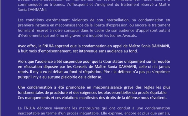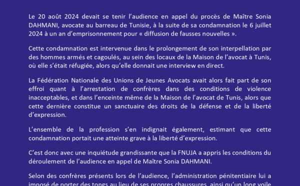La FNUJA a appris avec consternation l'arrestation, brutale ce lundi 13 mai 2024, de notre confrère Mehdi ZAGROUBA, membre de l’association tunisienne des jeunes avocats.    Sa violente arrestation s’est accompagnée d’un saccage de maison de l’avocat par des agents armés et intervient dans les mêmes conditions...