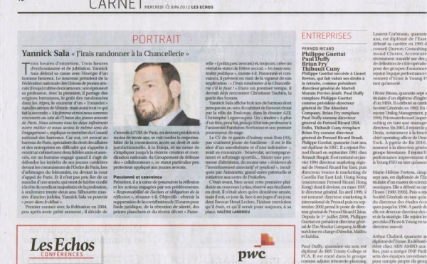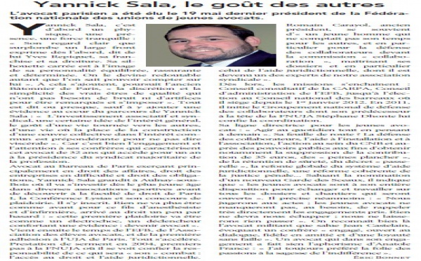 LES ECHOS - Le 13 juin 2012 Par Valerie Landrieu "Trois heures d'entretien. Trois heures d'enthousiasme et de jubilation. Yannick Sala défend sa cause avec l'énergie d'un homme heureux. Le nouveau président de la Fédération nationale des Unions de jeunes avocats (Fnuja) cultive deux amours : son épouse et sa profession. Avec la...