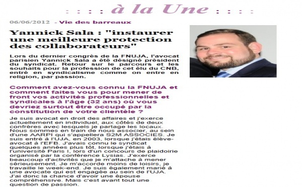 Actuel-avocat.fr - Edition du 6 Juin 2012 Par Anne Portmann http://www.actuel-avocat.fr/droit-justice-cabinet/vie-des-barreaux/a-196551/yannick-sala-instaurer-une-meilleure-protection-des-collaborateurs.html