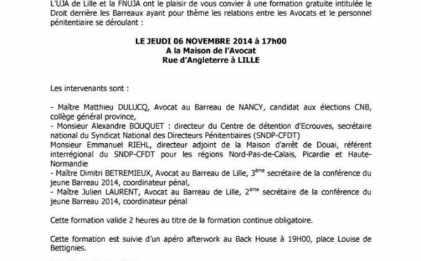 L'UJA de Lille et la FNUJA ont le plaisir de vous convier à une formation gratuite intitulée "Le droit derrière les Barreaux" ayant pour thème les relations entre les Avocats et le personnel pénitentiaire. Intervenants: - Maitre Matthieu DULUCQ, Avocat au Barreau de Nancy, candidat aux élections CNB, collège général province...
