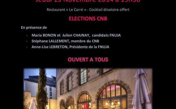L'UJA de Rennes vous convie à un cocktail dinatoire organisé au Restaurant "Le Carré" pour la présentation des candidats FNUJA au CNB. En présence de : - Maria BONON et Julien CHAINAY, candidats FNUJA - Stéphane LALLEMENT, membre du CNB - Anne-Lise LEBRETON, Présidente de la FNUJA Informations: ujarennes@gmail.com