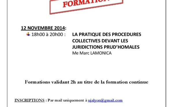 L'UJA de Lyon organise une formation animée par Me Marc LAMONICA, Avocat au Barreau de LYON, sur la pratique des procédures collectives devant les juridictions prud'homales. La formation est gratuite pour les adhérents et au tarif de 20€ pour les non-adhérents. La formation aura lieu au 40 rue de Bonnel, en salle...