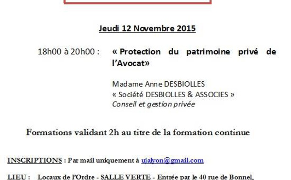 L'UJA de LYON organise une formation sur le thème de la protection du patrimoine privé de l'avocat le 12 novembre prochain de 18h à 20h. Cette formation est dispensée par Madame Anne DESBIOLLES, Conseil en gestion privée Formation validante gratuite pour les adhérents, 20€ pour les non adhérents.