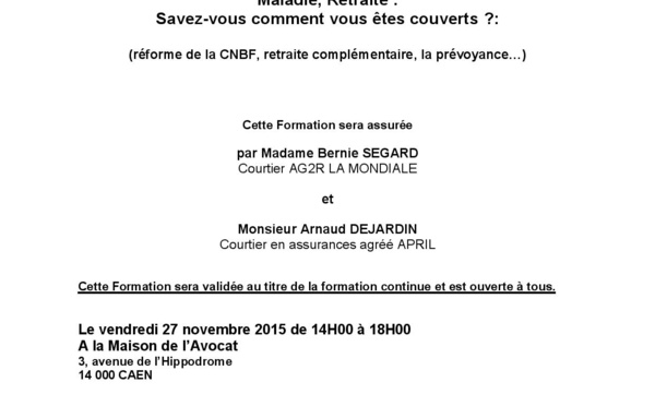 L'UJA de BASSE NORMANDIE organise une formation sur la protection sociale des avocats intitulée "Maladie, Retraite: savez vous comment vous êtes couverts? " Vendredi 27 novembre 2015 de 14h à 18h à la Maison de l'avocat. Formation dispensée par Madame Bernie SEGARD, Courtier AG2R la Mondiale et Monsieur Arnaud...