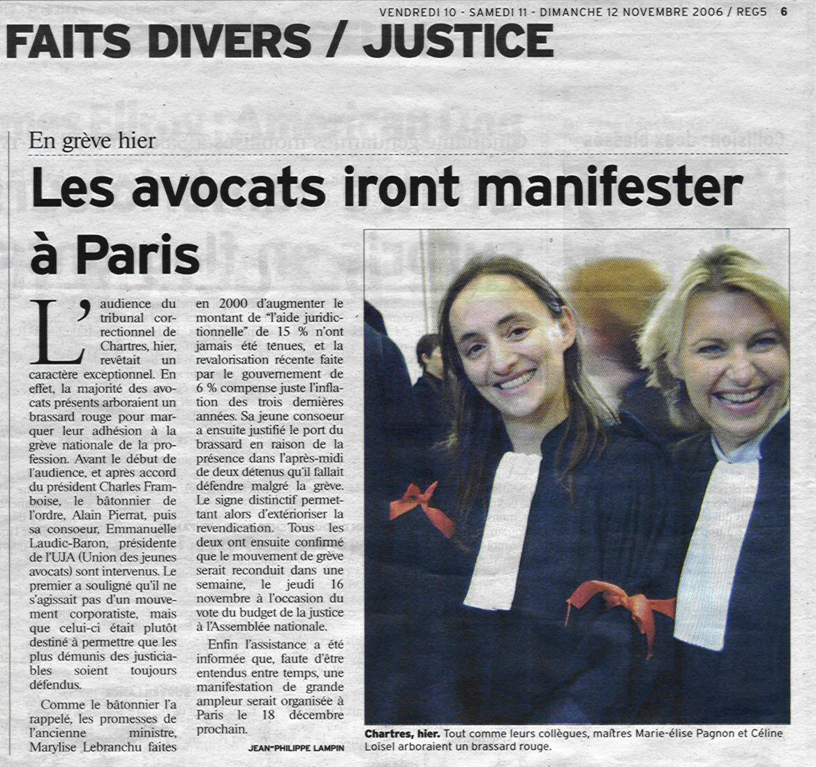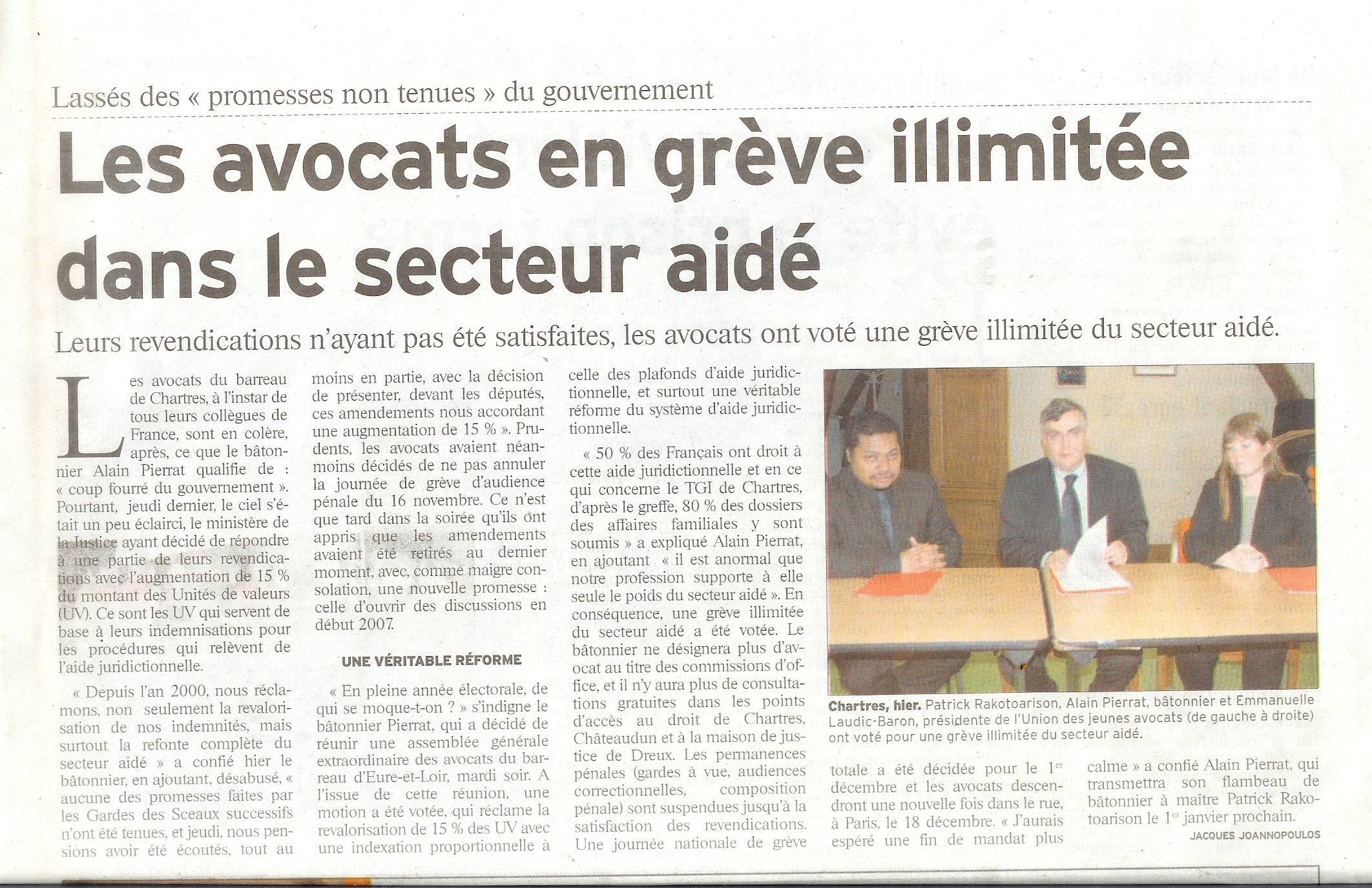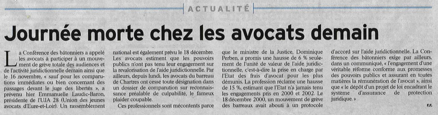Dans le cadre du mouvement national de revendication en matière d'aide juridictionnelle, le Barreau de CHARTRES a opté pour une grève totale et générale de l'activité juridictionnelle lors des deux journées d'action nationales des 9 et 16 novembre 2006.